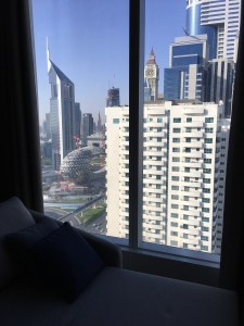În Dubai ne cazăm de obicei pe Sheik Zayed Road, nu departe de World Trade Center, unde se desfășoară târgurile. Alegem Voco (fost Nassima) sau Conrad, cu o preferință pentru Voco. În funcție de noroc nimerim camere mișto cu vederea spre Sheik Zayed Road și atunci ne bucurăm de o priveliște încântătoare de zgârie nori sau pentru cei mai puțin norocoși, nimerim o cameră cu ferestre puține, iar acelea îndreptate spre pustiul neatins, nisip murdar și construcții în desfășurare. În Voco plusurile sunt mirosul minunat pe care îl are recepția, ți micul dejun bogat, cu humus excelent și fac omlete bune. Singurul minus e piscină. În Conrad au o piscina super, dar micul-dejun este slăbuț și sunt limite de la lift, putând merge cu liftul doar la etajul la care stai și etajele publice.