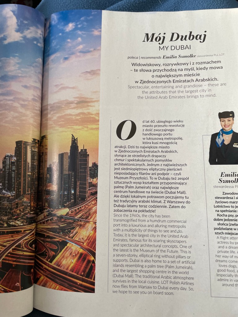 Merg din nou în Dubai, de dat aceasta cu Lot – cea mai proastă alegere posibilă. Un avion mic pentru un zbor de peste 5 ore, condiții precare, dar prețuri mai mai ca și la Emirates. Singurul avantaj, orele de zbor. Nu am ales eu avionul, ci persoane care nu au mai fost până acum în Dubai. Oameni cu puțin timp la dispoziție ce visează cai verzi pe pereți dupa un zbor de 5 ore.